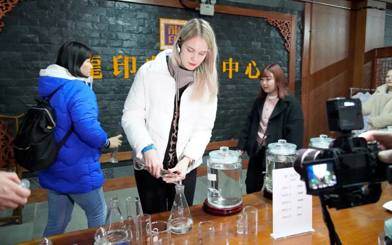 北京語言大學(xué)國際中文學(xué)院領(lǐng)導(dǎo)和老師,以及來自俄羅斯、塞爾維亞、韓國、泰國等國家和地區(qū)的170多名海外留學(xué)生,先后參觀了酒博物館、地下酒窖和黨建天地,在感受板城燒鍋酒傳承三百余年的老五甑釀造工藝的同時(shí),共同聆聽、探尋板城酒業(yè)背后的深厚歷史與文化底蘊(yùn)。在深入了解企業(yè)脈絡(luò)、品牌文化后,對冀酒文化的認(rèn)識更加深刻。