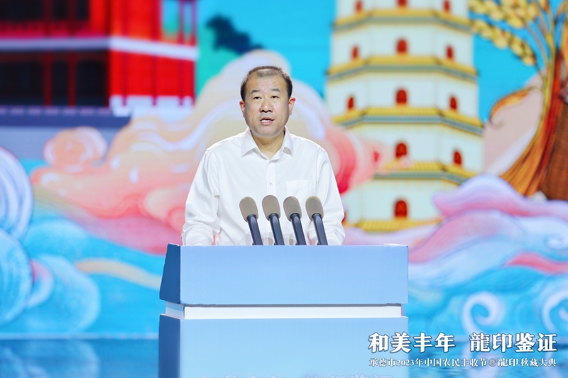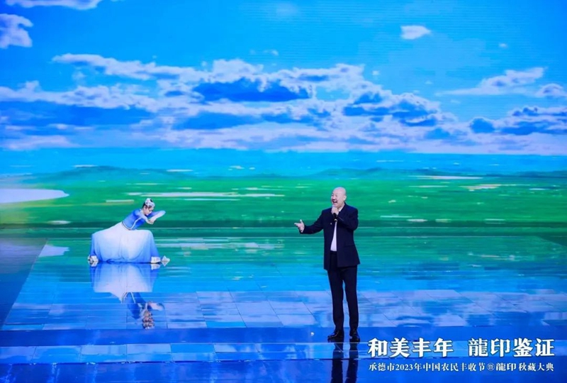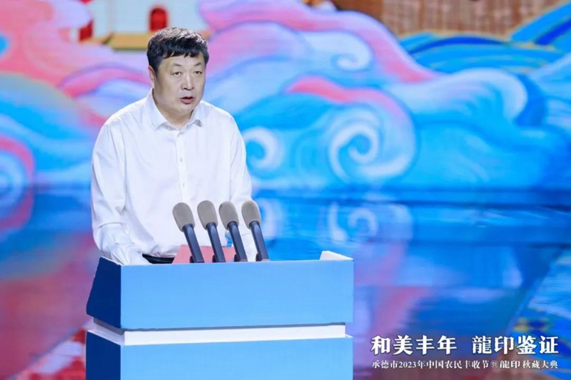整場慶典以記錄承德人民美好生活、美景美食、農(nóng)業(yè)碩果的視頻《承德十二時辰》拉開帷幕。承德市人民政府副市長崔萬峰率先上臺致辭,并對承德市2023年中國農(nóng)民豐收節(jié)暨龍印秋藏大典的召開表示熱烈祝賀。