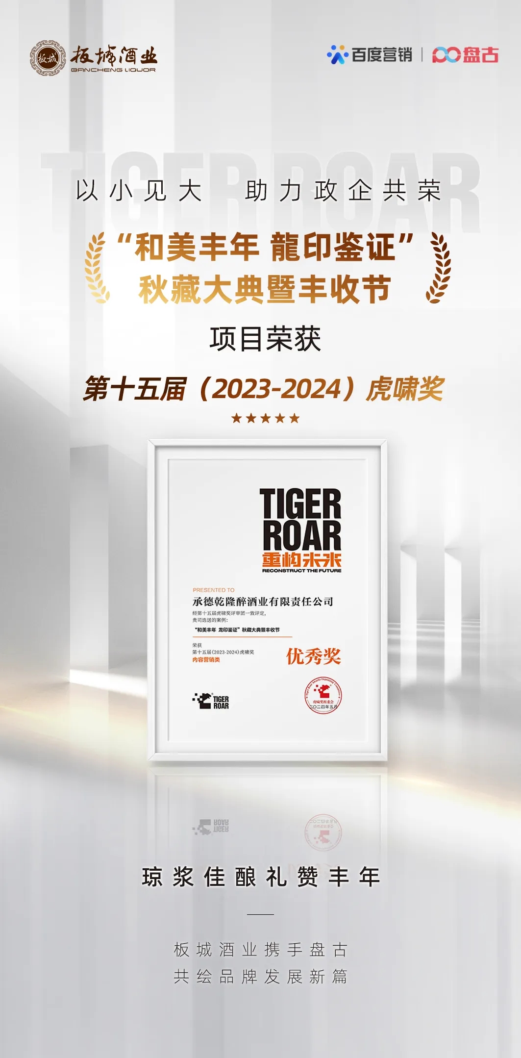 近日,第十五屆虎嘯獎(jiǎng)?lì)C獎(jiǎng)典禮在上海舉辦,承德乾隆醉酒業(yè)有限責(zé)任公司憑借「“和美豐年龍印鑒證”秋藏大典暨豐收節(jié)」案例,以?xún)?yōu)異的內(nèi)容營(yíng)銷(xiāo)創(chuàng)意、資源整合能力及出色的營(yíng)銷(xiāo)效果,從1020家優(yōu)秀企業(yè)提交的4505件參賽作品中脫穎而出,榮獲第十五屆(2023-2024)虎嘯獎(jiǎng)內(nèi)容營(yíng)銷(xiāo)類(lèi)優(yōu)秀獎(jiǎng)。