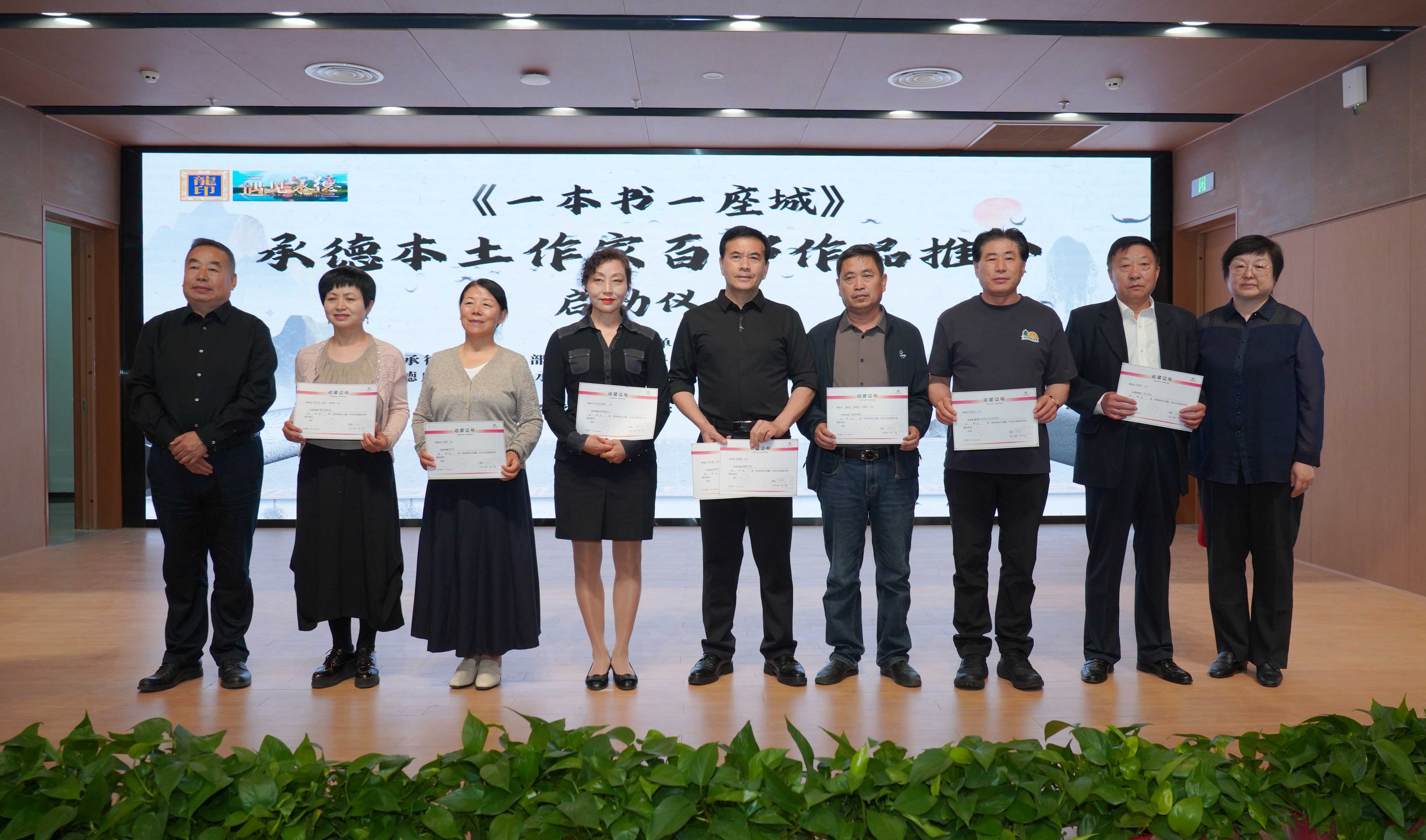 中共承德市委宣傳部三級調(diào)研員張穎和承德廣播電視臺總編輯楊潤忠為作家老師頒發(fā)收藏證書。
