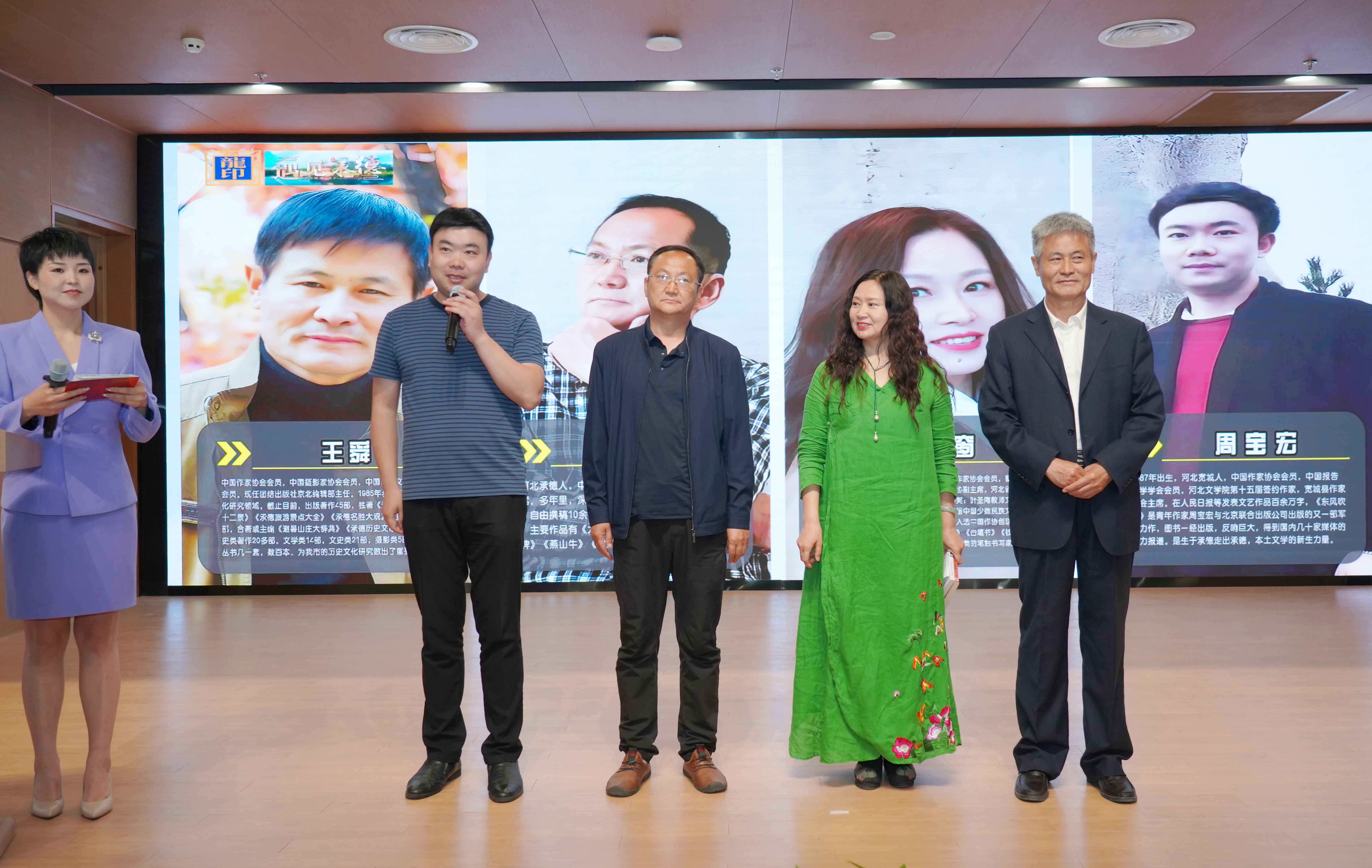 中共承德市委宣傳部三級調(diào)研員張穎,承德廣播電視臺總編輯楊潤忠,承德市旅文局副局長楊亦,承德市新聞工作者協(xié)會主席王德光,承德市作家協(xié)會主席王琦,板城酒業(yè)銷售市場總監(jiān)王曉波共同登臺,共同啟動承德市首屆本土作家推介活動儀式。