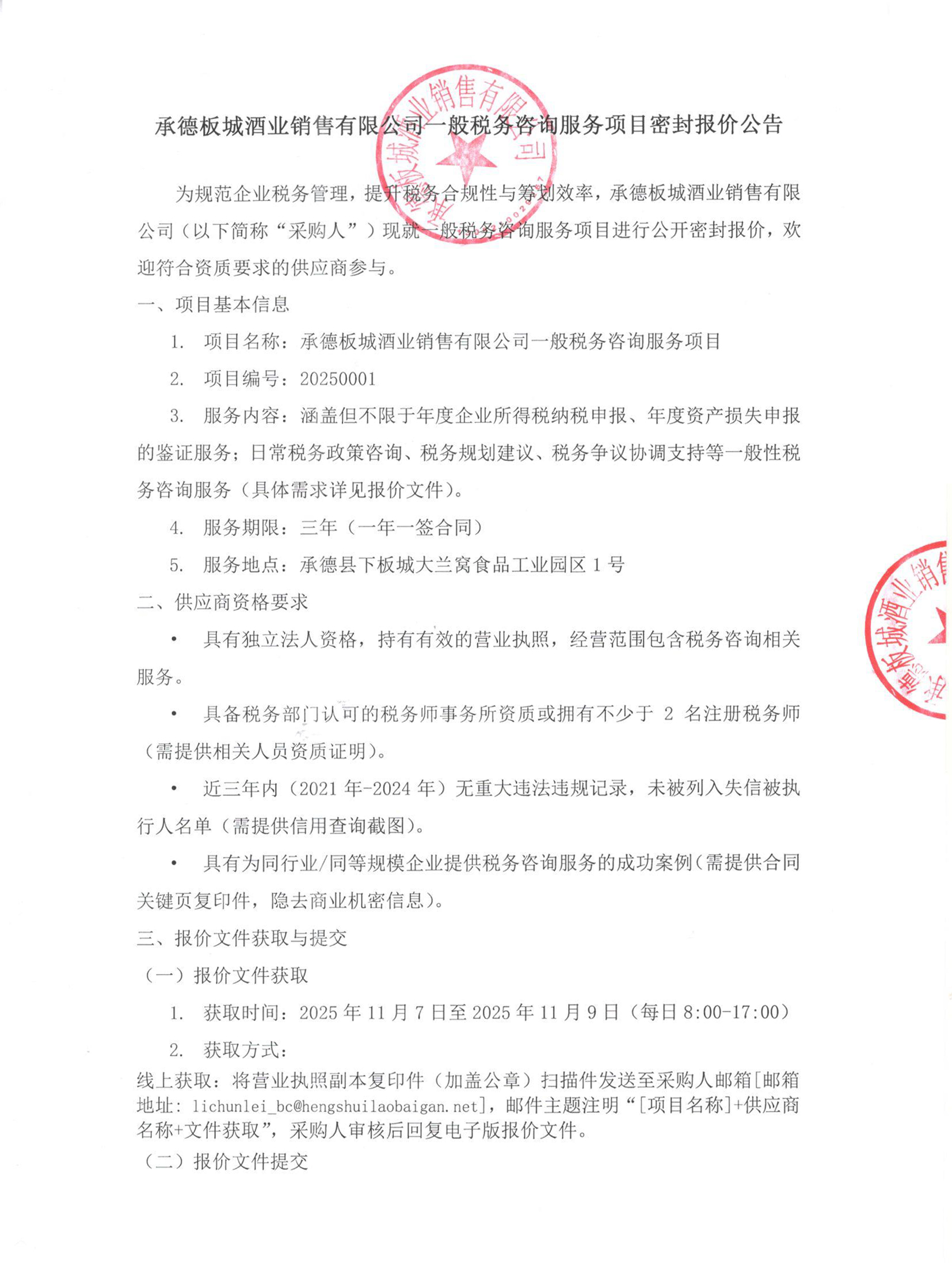 > 承德板城酒業(yè)銷售有限公司一般稅務(wù)咨詢服務(wù)項(xiàng)目密封報(bào)價(jià)公告