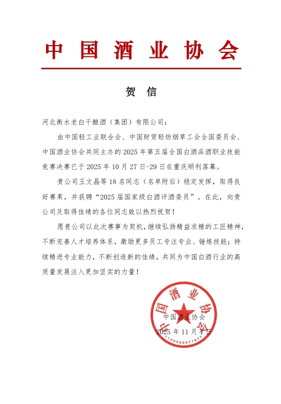 中國酒業(yè)協(xié)會(huì)發(fā)來賀信,在恭祝企業(yè)取得良好成績的同時(shí),希望以此次賽事為契機(jī),繼續(xù)弘揚(yáng)精益求精的工匠精神,不斷完善企業(yè)人才培育體系,持續(xù)增進(jìn)業(yè)務(wù)能力。
