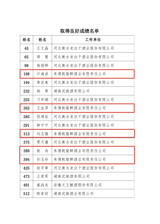 在第五屆全國白酒品酒職業(yè)技能競賽中,衡水老白干及旗下四家子公司18位選手穩(wěn)定發(fā)揮,取得良好賽果,被聘任為“2025屆國家級(jí)白酒評(píng)酒委員”;其中板城酒業(yè)孫玉玲、劉志強(qiáng)、王金萍、敖冉、亓海波5位選手參加比賽,通過比賽斬獲優(yōu)異成績,均被聘任為“2025屆國家級(jí)白酒評(píng)酒委員”。板城酒業(yè)成為河北省除衡水老白干酒業(yè)外最多入選人數(shù)的酒企,其中,敖冉、亓海波兩名選手初次參賽獲聘國家級(jí)白酒評(píng)酒委員。