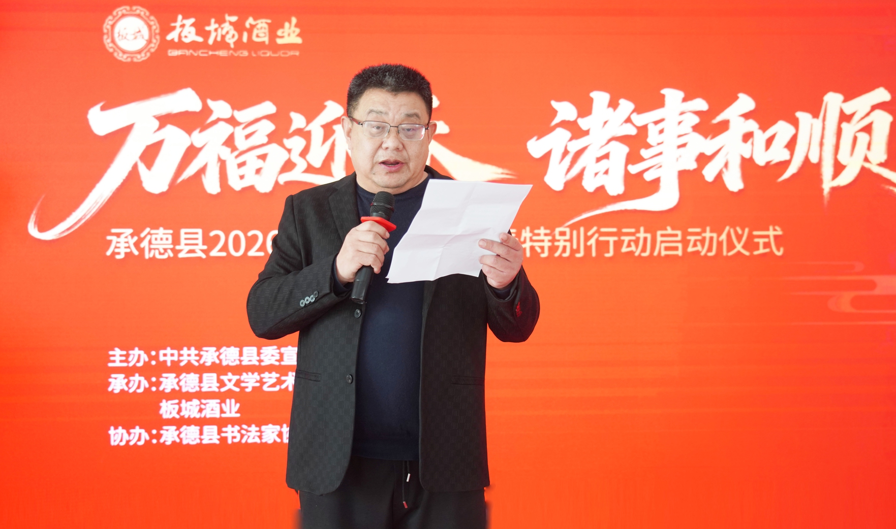 板城酒業(yè)品牌部經(jīng)理張文隆致辭,他講到,“諸事和順”是結(jié)合板城核心產(chǎn)品板城和順衍生的新春主題,承載著板城酒業(yè)對新年最美好的期許。今年是板城酒業(yè)舉辦“諸事和順”活動的第七年,持續(xù)通過新春禮包為廣大消費者送上美好心意。同時,這也是企業(yè)連續(xù)第四年與縣委宣傳部、縣文聯(lián)、市縣書協(xié)等單位攜手開展諸事和順迎新春,送春聯(lián)活動,旨在將優(yōu)秀春聯(lián)作品送至千家萬戶,讓家鄉(xiāng)父老在品味傳統(tǒng)文化的同時,感受到板城酒業(yè)的深情厚誼。