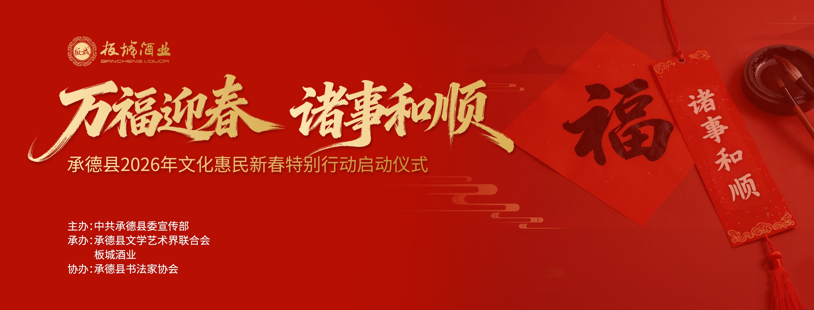 乙巳辭舊歲,丙午啟新程。1月16日,由中共承德縣委宣傳部主辦,承德縣文學藝術界聯(lián)合會、板城酒業(yè)承辦,承德縣書法家協(xié)會協(xié)辦的“萬福迎春·諸事和順——承德縣2026年文化惠民新春特別行動啟動儀式”在板城酒業(yè)圓滿舉辦!