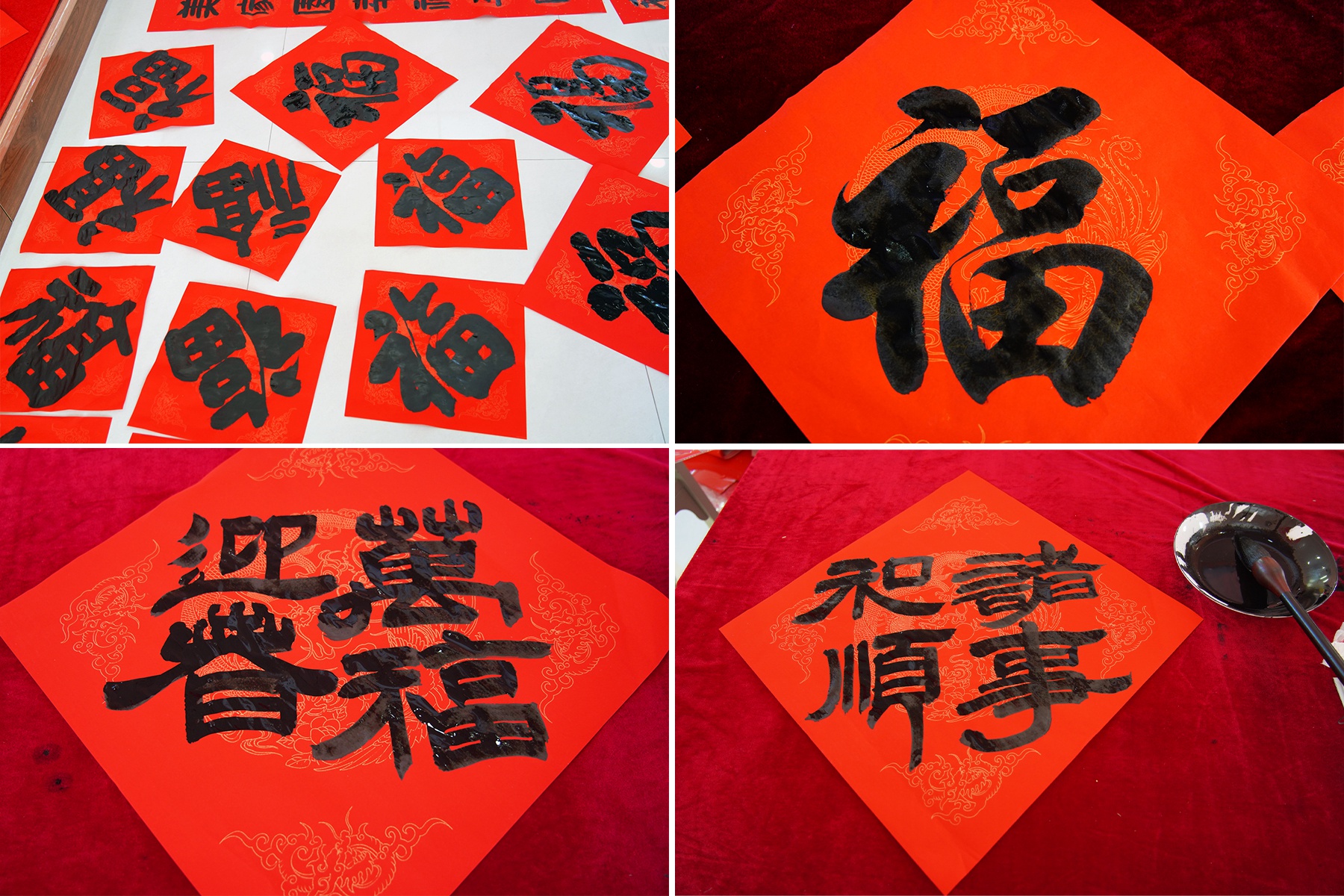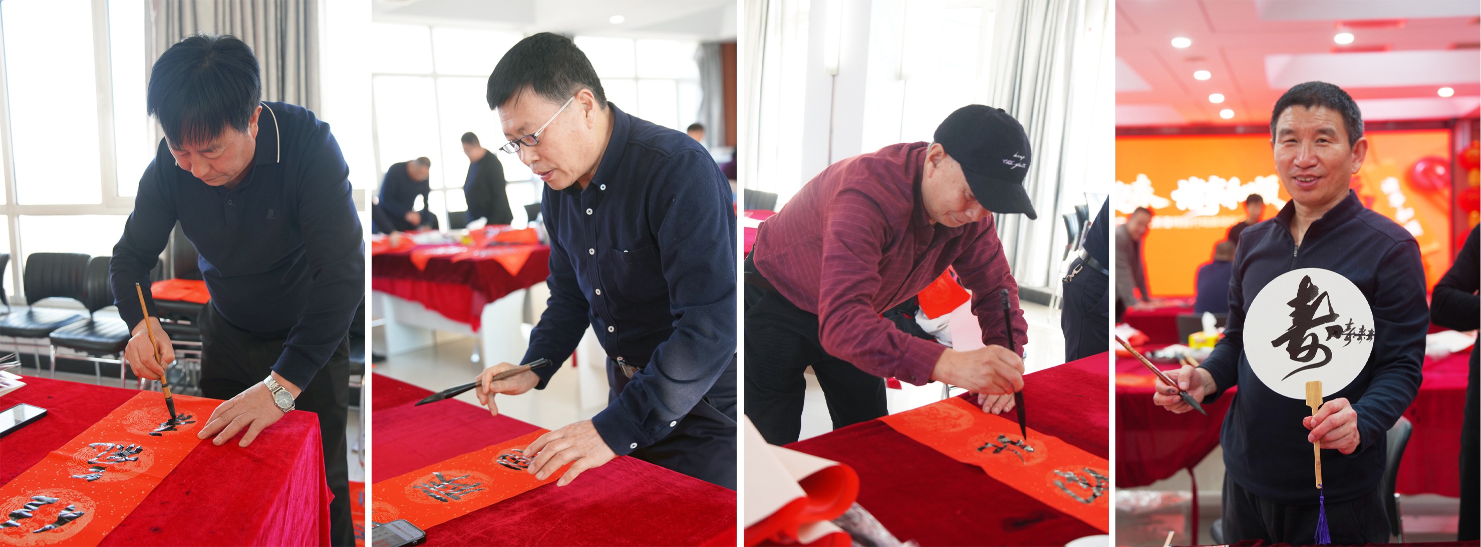 隨后,各位書法老師現(xiàn)場揮毫潑墨,書寫新春祝福。一張張紅彤彤的春聯(lián)象征著喜慶吉祥,傳遞著“萬福迎春,諸事和順”的美好愿望。