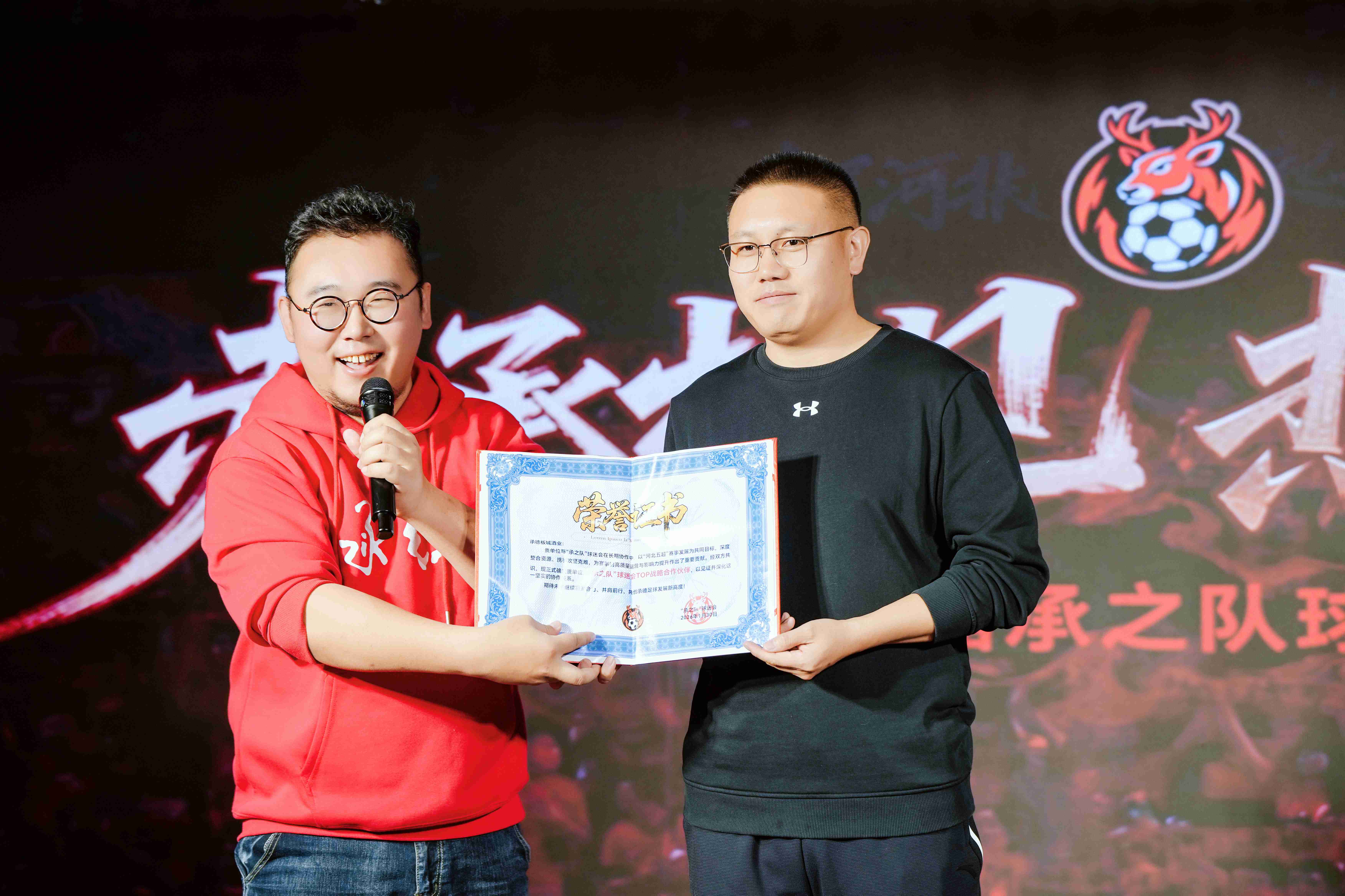 致辭結(jié)束后,現(xiàn)場舉行了授牌儀式,承德新鮮事兒創(chuàng)始人、“承之隊(duì)”球迷負(fù)責(zé)人朱孟博向板城酒業(yè)授予了“TOP戰(zhàn)略合作伙伴”榮譽(yù)證書,以表彰其長期以來的鼎力支持與深度協(xié)作,共同推動(dòng)承德足球事業(yè)的發(fā)展。這一榮譽(yù),見證著雙方深厚的情誼與堅(jiān)實(shí)的伙伴關(guān)系。